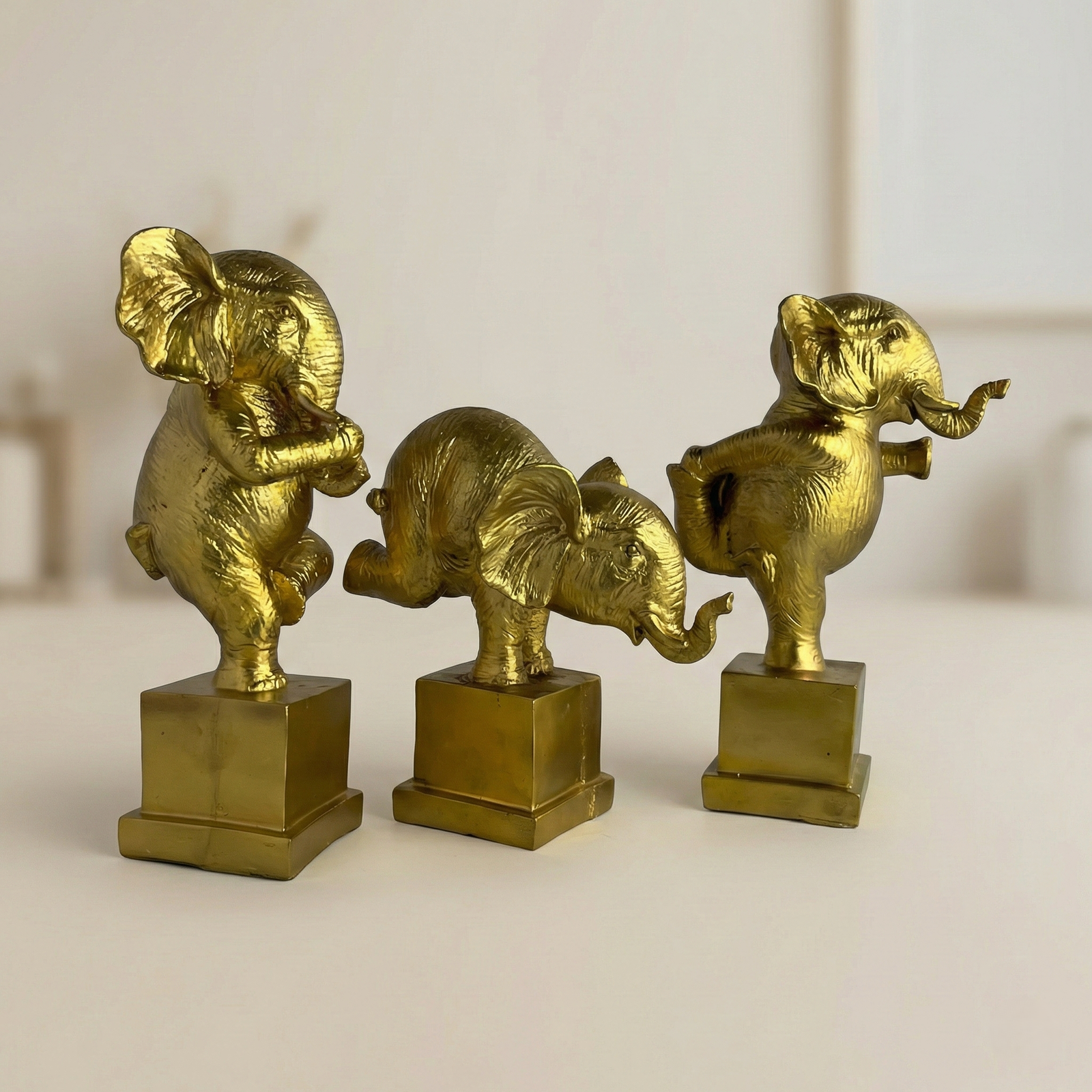 • Each elephant is depicted in a dynamic pose, with raised trunks and twirling tails, conveying a sense of harmony and unity among the trio.